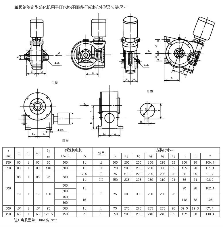 特征 環(huán)面蝸桿副具有承載能力大,傳動效率高,使用壽命長等特點,被廣泛應(yīng)用于輪胎定型硫化機中。 適用范圍 本系列減速器適用于36in、40.5in、42in、46in、55in、63.5in、85in、100in等各種規(guī)格的輪胎硫化機。 系列 單級減速器中心距:265mm,320mm,360mm,380mm,450mm。 雙級減速器中心距:140mm/280mm,160mm/320mm。